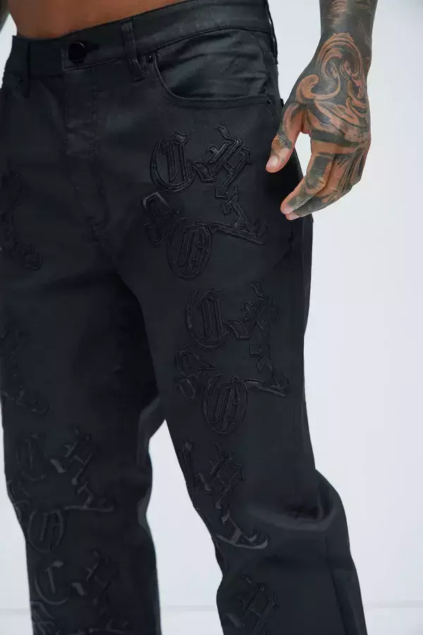 Pantalón de calce recto confeccionado en denim con terminación engomada. Diseño exclusivo con relieve en letras góticas distribuidas a lo largo de ambas piernas, aportando un estilo urbano y distintivo. Cuenta con cinco bolsillos, trabillas para cinturón y cierre frontal con botón metálico. Ideal para quienes buscan una prenda llamativa, con personalidad y presencia.